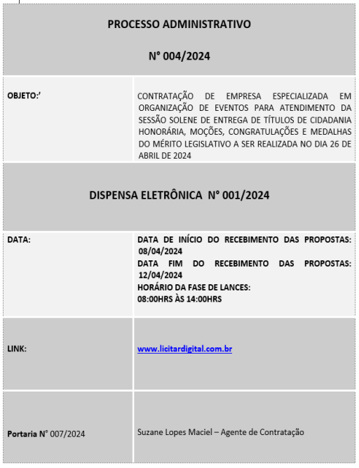 OBJETO DA DISPENSA ELETRÔNICA – O objeto da presente dispensa é a escolha da proposta mais vantajosa para contratação de empresa especializada em organização de eventos para atendimento da sessão solene de entrega de títulos de cidadania honorária, moções, congratulações e medalhas do mérito legislativo a ser realizada no dia 26 de Abril de 2024 , conforme condições, quantidades e exigências estabelecidas neste Aviso de Contratação Direta e seus anexos, conforme cotação  de preços.