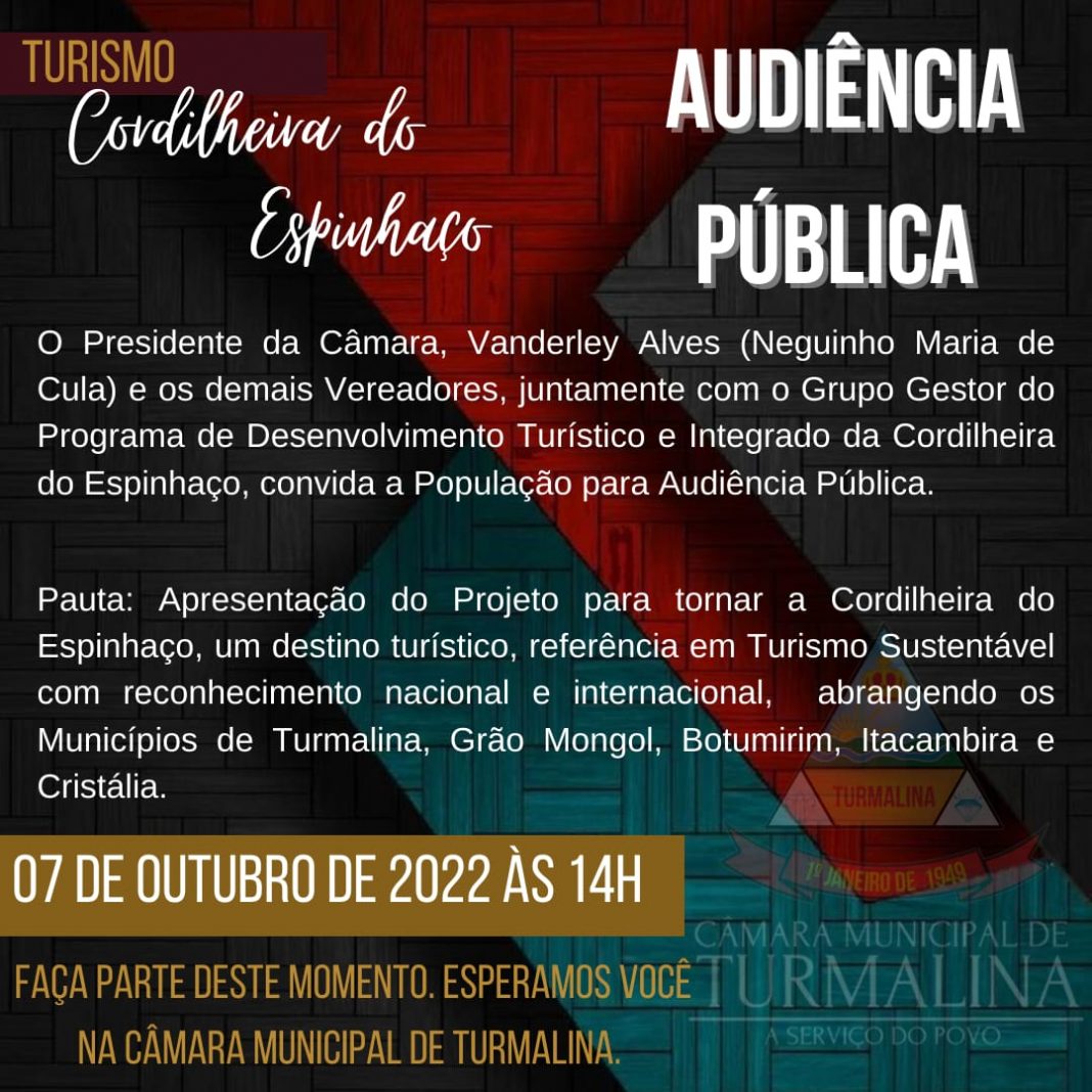 Nesta última sexta-feira, dia 07 de Outubro de 2022, a Câmara Municipal de Turmalina abriu as suas portas para receber o Grupo Gestor do Programa de Desenvolvimento Turístico e Integrado da Cordilheira do Espinhaço, Vereadores, Servidores da Casa e População para debaterem sobre um assunto de grande relevância para Turmalina e região que é o Turismo Sustentável. A Pauta abordou a sua importância nos quesitos culturais, socioeconômicos e ambientais.