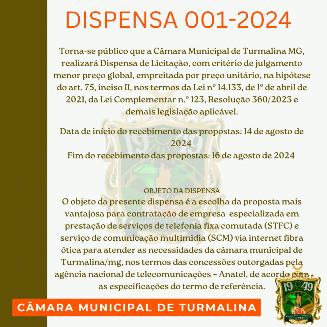 Torna-se público que a Câmara Municipal de Turmalina/MG, realizará Dispensa de Licitação, com critério de julgamento MENOR PREÇO POR ITEM, empreitada por preço unitário, na hipótese do art. 75, inciso II, nos termos da Lei nº 14.133, de 1º de abril de 2021, da Lei Complementar n.º 123, Resolução interna 360/2023 cap. XVIII Art.39, Decreto Municipal 131/2023 e demais legislação aplicável.