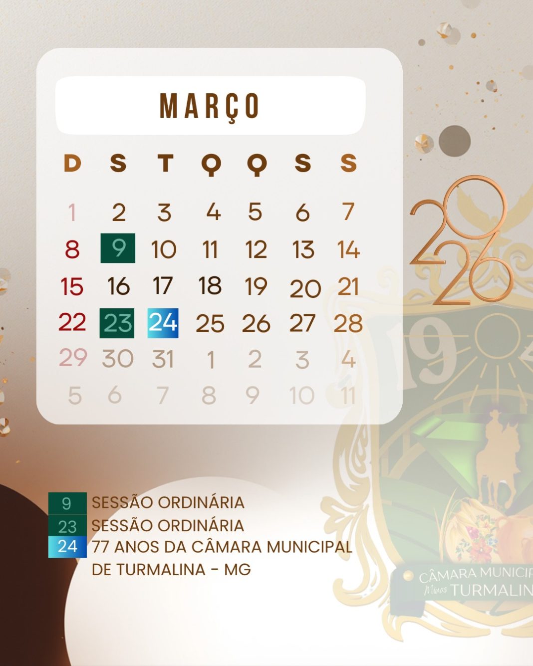CONFIRA O CALENDÁRIO DE REUNIÕES ORDINÁRIAS DA CÂMARA MUNICIPAL DE TURMALINA MG – MARÇO 2026