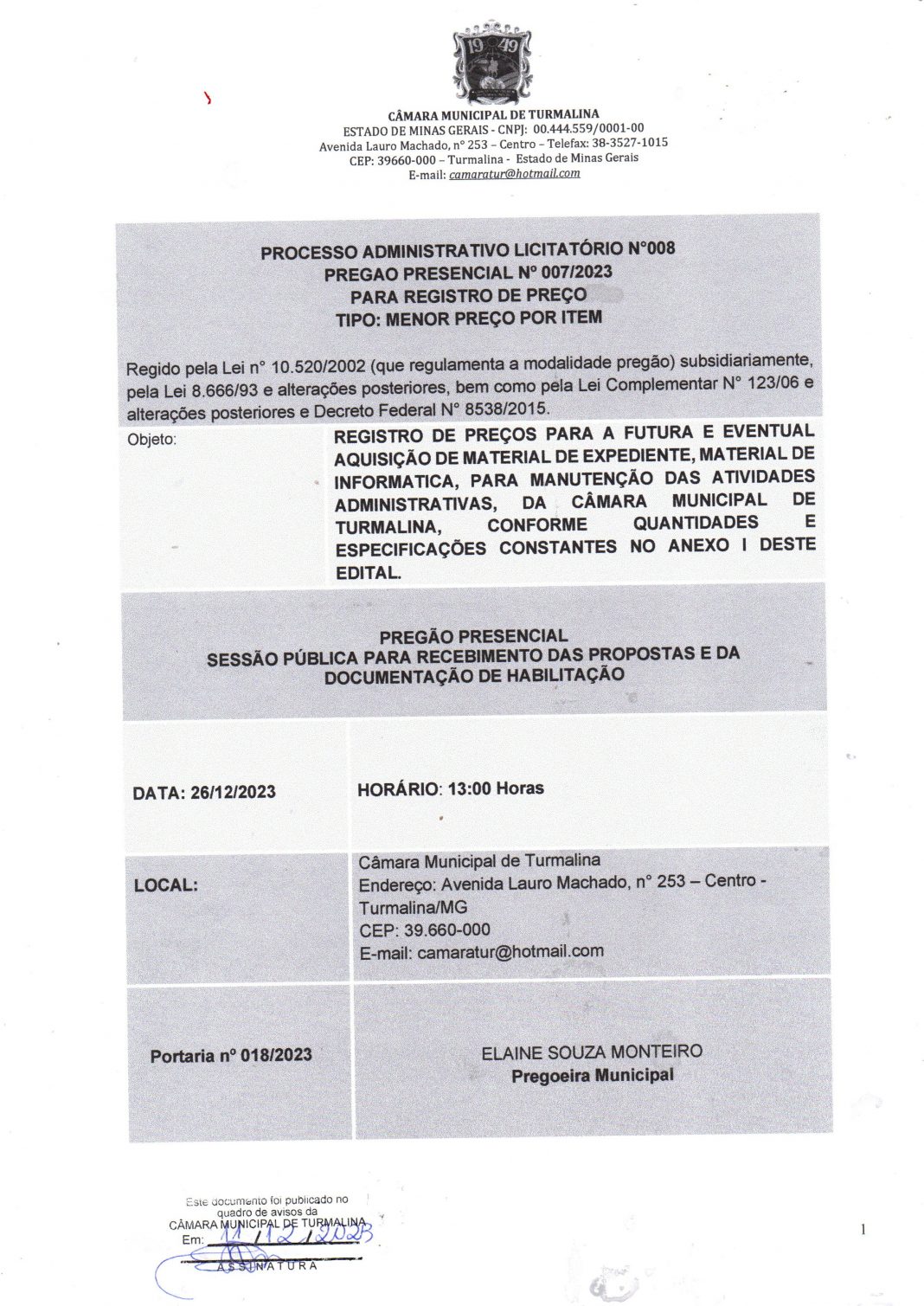 A CÂMARA MUNICIPAL DE TURMALINA/MG– através da C.P.L TORNA PÚBLICO que  fará realizar PREGÃO PRESENCIAL cujo objeto é  aquisição material de expediente e suprimentos de informática para atender as atividades administrativas e legislativas da Câmara Municipal de Turmalina –  Processo Administrativo Licitatório  008/2023 – Pregão Presencial  Nº 007/2023, abertura 26/12/2023 às 13:00 h. Edital no Setor de Licitação, na sede da Câmara Municipal de Turmalina, na Av. Lauro Machado 253 Centro, das 7:00 as 11:30 e 13:00 às 16:30 ou pelo e-mail camaratur@hotmail.com. Informações pelo tel. (38) 3527-1015 ou (38) 99195 6570.Elaine Souza Monteiro – Pres. CPL. Turmalina 11/12/2023.