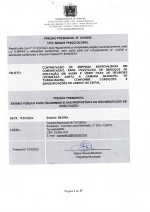 A CÂMARA MUNICIPAL DE TURMALINA/MG– através da C.P.L TORNA PÚBLICO que  fará realizar PREGÃO PRESENCIAL cujo objeto é  Contratação de empresa especializada em comunicação, para prestação de serviços de gravação em áudio e vídeo para as reuniões ordinárias –  Processo Administrativo Licitatório  012/2023 – Pregão Presencial  Nº 010/2023, abertura 11/01/2024 às 08:00 h. Edital no Setor de Licitação, na sede da Câmara Municipal de Turmalina, na Av. Lauro Machado 253 Centro, das 7:00 as 11:30 e 13:00 às 16:30 ou pelo e-mail camaratur@hotmail.com. Informações pelo tel. (38) 3527-1015 ou (38) 99195 6570.Elaine Souza Monteiro – Pres. CPL. Turmalina 26/12/2023.